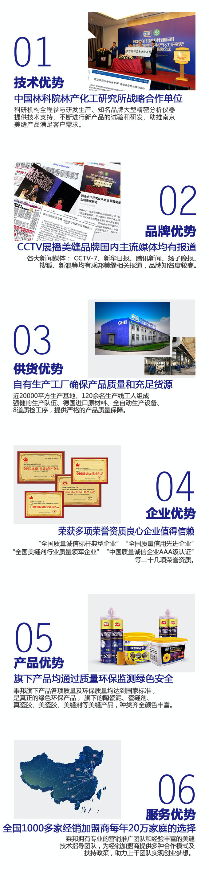 南京乘邦環(huán)??萍加邢薰境闪⒂?005年,是集南京瓷磚美縫南京美縫施工、高科技產(chǎn)品的研發(fā)與銷&售等產(chǎn)業(yè)的南京瓷磚美縫公司。目前公司主打美縫產(chǎn)品為國(guó)內(nèi)推出的傳統(tǒng)美縫劑升級(jí)產(chǎn)品:乘邦納米陶瓷泥、水性環(huán)氧彩砂,天然砂質(zhì)顏料,化妝品般安全無(wú)污染。乘邦陶瓷泥顏色豐富,大大提升裝飾效果,打造魔幻家居,讓家也可以炫酷起來(lái)。它綠色環(huán)保防霉防污,堅(jiān)硬如瓷細(xì)膩光潔,不僅做到瓷磚縫隙“不變黑”,而且在為每一個(gè)家庭健康美麗而努力,這是乘邦公司的最高準(zhǔn)則,也是乘邦人為之努力奮斗的目標(biāo),以此目標(biāo)乘邦本著"誠(chéng)信、合作、專業(yè)、超越"的理念,詮釋優(yōu)質(zhì)服務(wù),演繹品質(zhì)生活。同時(shí)公司擁有一支管理完善、經(jīng)驗(yàn)豐富的專業(yè)美縫施工隊(duì)伍。在南京瓷磚美縫價(jià)格方面也有很大的優(yōu)勢(shì),每年為南京近萬(wàn)家庭提供美縫服務(wù),其自主研發(fā)的乘邦牌產(chǎn)品在10余省市已有近千個(gè)代理商,在全國(guó)范圍內(nèi)享有很高的知名度。